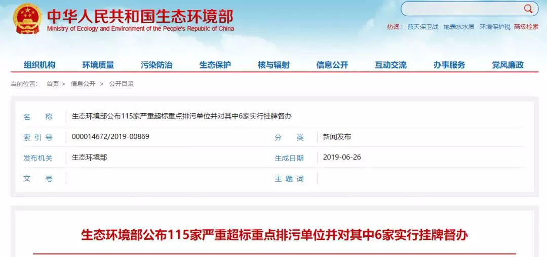 2019年6月26日,生態(tài)環(huán)境部向社會(huì)公布了2019年第一季度自動(dòng)監(jiān)控?cái)?shù)據(jù)嚴(yán)重超標(biāo)的115家重點(diǎn)排污單位名單,并對(duì)其中6家重點(diǎn)排污單位主要污染物排放嚴(yán)重超標(biāo)排污環(huán)境問題掛牌督辦。