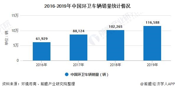 根據(jù)中國銀行保險監(jiān)督管理委員會的新車交強(qiáng)險統(tǒng)計(jì)數(shù)據(jù),2019年全國環(huán)衛(wèi)車輛銷量116588輛,同比增長14.01%,近三年復(fù)合增長率為23.48%,同比增速有所減緩,環(huán)衛(wèi)裝備行業(yè)進(jìn)入了穩(wěn)步增長時期。