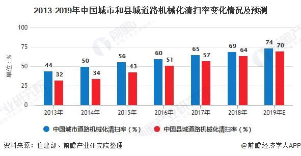 環(huán)保行業(yè)智慧化趨勢明顯。根據(jù)住建部《中國城鄉(xiāng)建設(shè)統(tǒng)計(jì)年鑒》各年統(tǒng)計(jì)數(shù)據(jù),我國城市和縣城道路的機(jī)械化清掃率不斷提升,2018年分別達(dá)到69%、64%,初步估計(jì)2019年達(dá)到74%和70%。